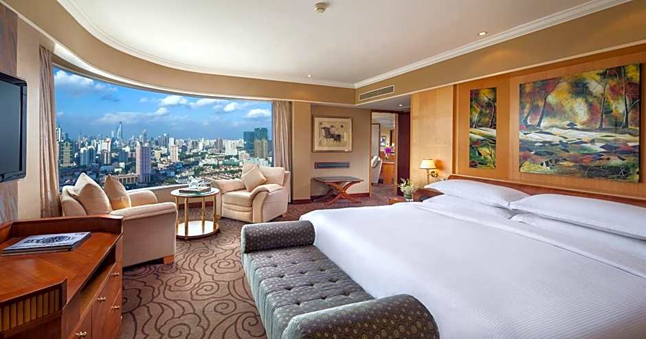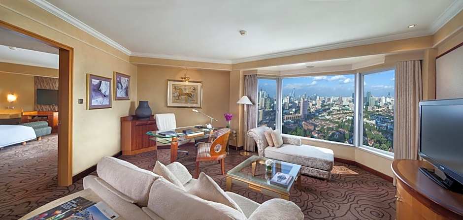 Offering panoramic views of Shanghai skyline from over-sized windows, this spacious suite features a separate lounge, a work/dining area, fax/printer and stereo system. Also include a 42-inch LCD TV and ample bathroom with bathtub and showers.
