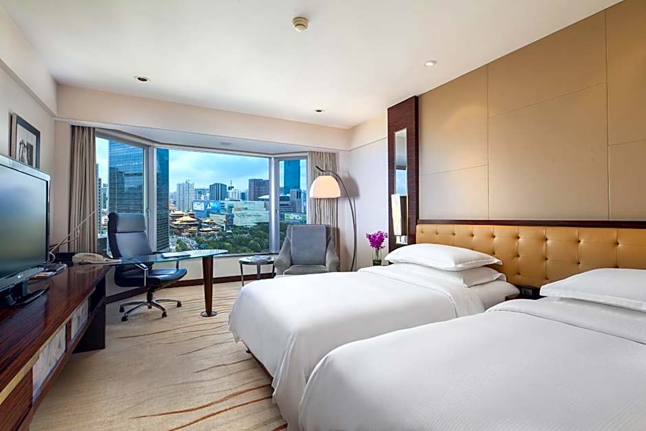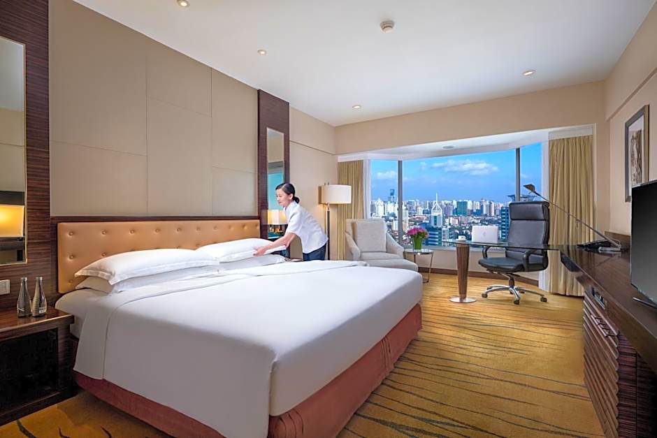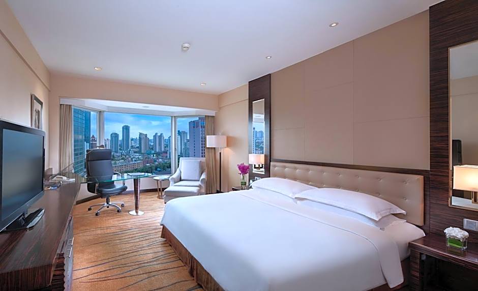 This spacious room features over-sized windows overlooking Shanghai skyline and Oriental Pearl Tower. Guests can enjoy city views and get to work at the large desk, or relax in the armchair.